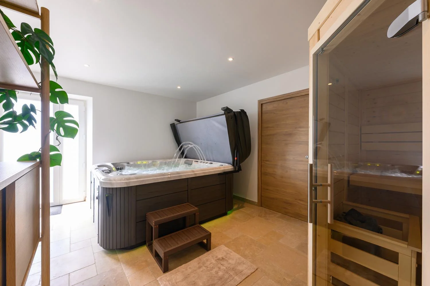 Offrez-vous une parenthèse de sérénité dans notre espace bien-être privatif, où tout a été pensé pour votre détente : profitez de la chaleur enveloppante d’un sauna en bois, plongez dans les bulles apaisantes d’un jacuzzi haut de gamme, puis prolongez l’expérience avec une douche rafraîchissante pour un moment de relaxation total, digne d’un spa de luxe.